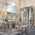 Product Feature: ??Fixed Table Top ??Legs & Pedestal Table ??Hollow Carving Design ??Padded Seat Cushion ??Nailhead Trim ??Curio w/Touch Light ??Curved Drawer Top