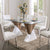 The table in this contemporary set features a tempered glass top with a beveled-edge and a unique, geometric double pedestal base with a striking two-tone finish to give your dining room an instant focal point. Combined with plush cushioned faux leather dining chairs to keep guests resting comfortably, it provides the perfect backdrop for entertaining and sharing many memorable meals. Tapered chrome chair legs and a high-gloss white finish complete this elegant set.