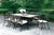 Host a quaint dinner party outside with this charming outdoor dining set. The lengthy table top features a beautiful reinforced top with elegant mosaic detailing. For durability and style, the antique black finished aluminum framework can be found along both table and chairs. Paired chairs also come with handy tie-back ivory cushions for extra comfort and charm.