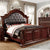 Make a bold statement in the Master suite with this grand bedroom set. The headboard has a carved frame and is upholstered with button tufted leatherette in espresso. The chest, dresser, and night stand have a matching bold design and antique gold hardware. All are finished in a deep brown cherry.