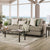 Soft, comfortable flecked taupe fabric contributes to a pleasurable feeling everytime someone lounges deep into this American-made plush sofa experience.