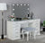 A series of glitzy bulbs line the large full-bleed mirror, and a glass tabletop adds to the luxurious appeal.