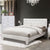 This white padded leatherette bed helps bring about the beauty of this set. Crystal-like acrylic buttons adorn the tufting in the headboard, while matching case goods mirror the simplicity of the bed with straight lines and simple silhouettes. Available in five sizes.