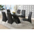 A bold contemporary base supports this rectangular glass table top. Seating six comfortably the chairs have unique chrome design upholstered in two color options.