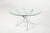 Circular clear tempered glass is held up by entwining chrome legs to create a poised composition. Table comfortably fits four people. Also available as a rectangular table.